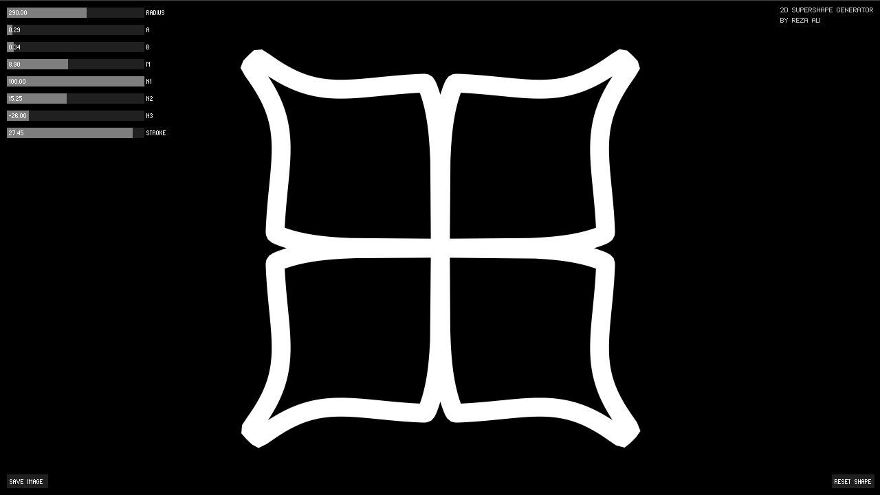 Super Shapes are intricate forms generated by evaluating the Superformula with varying input parameters. The Superformula produces visually stunning shapes that can be incorporated into more complex graphics or compositions — often seen in demoscene art. The application is designed to be both interactive and minimal, allowing users to explore the diversity of these forms effortlessly.