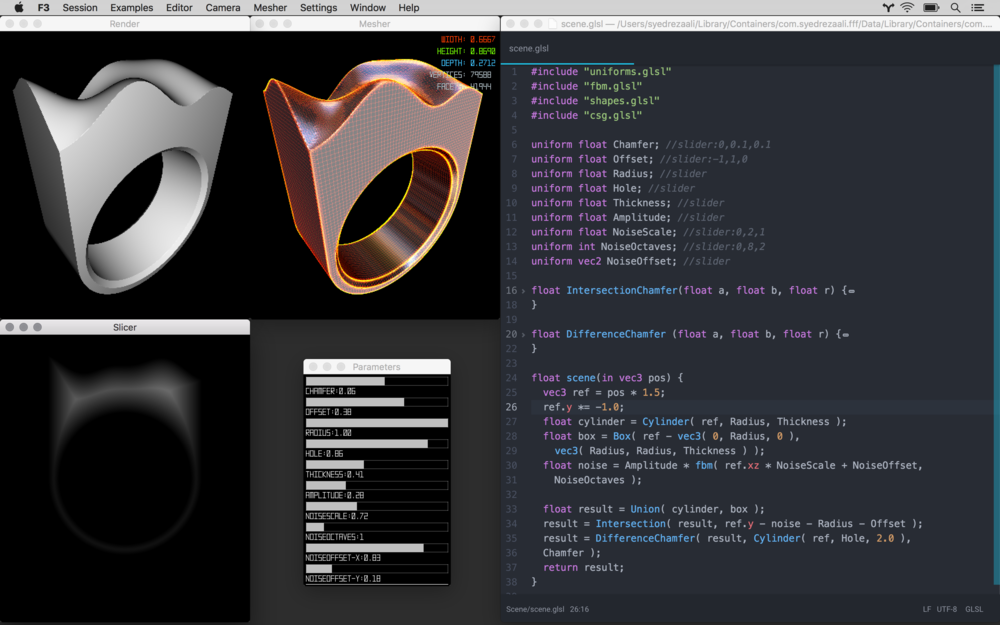 Furthermore, F3's interface is unlike anything before. Its end user experience is heavily influenced by Bret Victor's talk: Inventing on Principle. Its interface is built to give you immediate feedback while changing code and/or parameters, thus not only is F3 a powerful tool for designing form, its a great teaching & research tool. If you want to get deeper into understand the mathematics of SDFs and learn more about procedural / algorithmic design, F3 will help you explore and understand how to bend space!